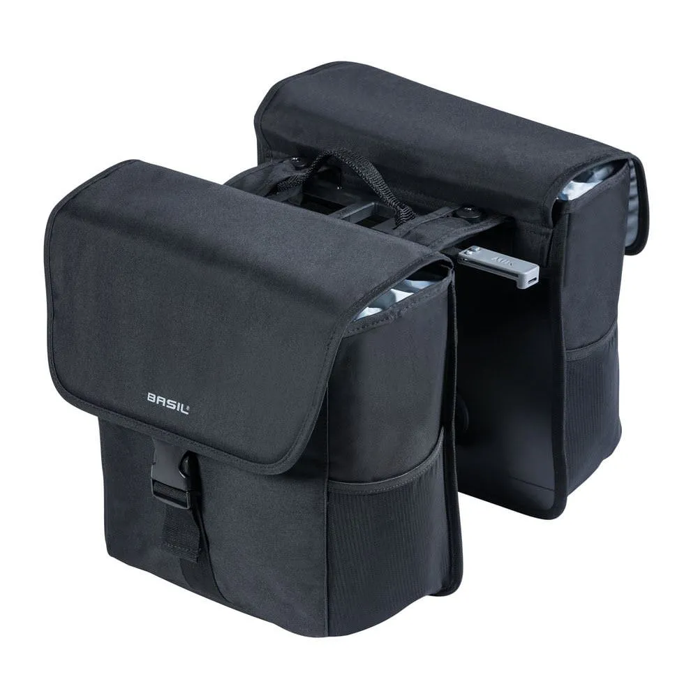 De dubbele fietstas Go MIK van Basil heeft een ruime inhoud van 32 liter en is gemaakt van waterafstotend polyester. De tas is uitgevoerd in de kleur zwart en voorzien van reflecterende elementen en een MIK-adapterplaat.