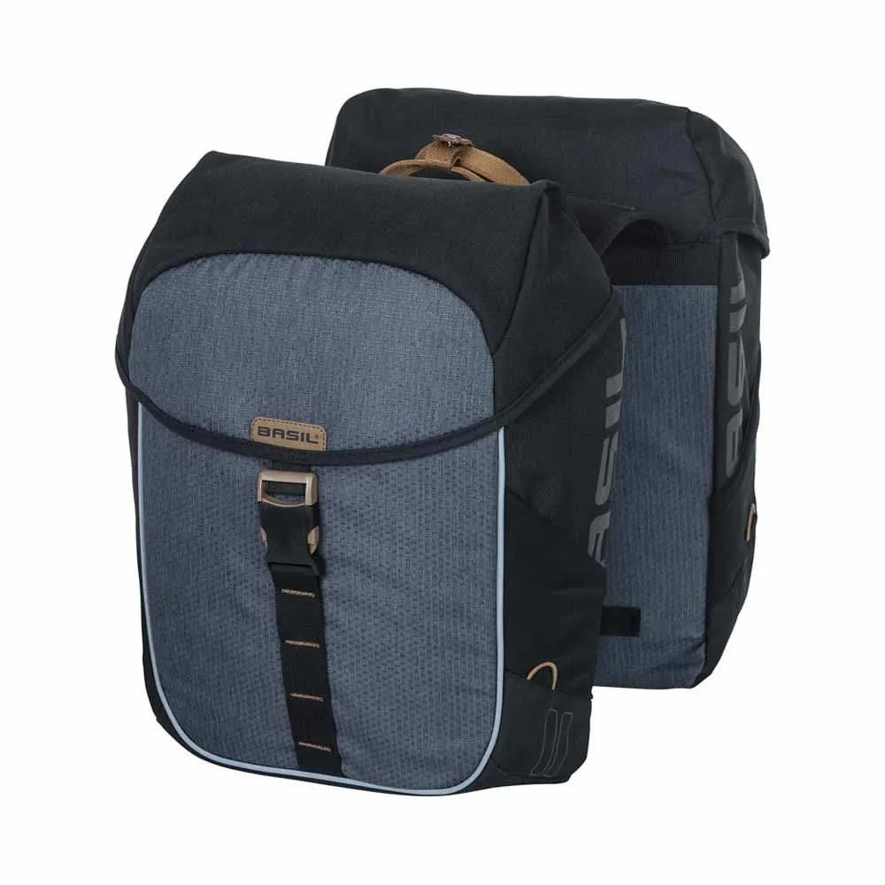De Basil Miles Double Bag is een waterdichte dubbele fietstas met een ruime inhoud van 34 liter. Boodschappen doen of die fietstrip door de Ardennen, deze dubbele fietstas maakt jouw fietsrit makkelijker en leuker. De donkergrijze/antraciete kleur en bruine details maken de tas stijlvol. Bij een flinke regenbui zorgt het waterdichte materiaal ervoor dat de inhoud van de tas droog blijft. Door het Basil Universal Bridge System past de tas op alle bagagedragers (ook e-bike) en kan die gecombineerd worden met bevestigingssystemen als Racktime, Carrymore en i-Rack. De reflectiedetails helpen je om beter zichtbaar te zijn in het donker. Ook is er gedacht aan een bevestigingsmogelijkheid voor ledverlichting. De dubbele fietstas sluit met behulp van een rolsluiting en kliksluiting en heeft een stevige binnenvoering. Deze Basil Miles Double Bag is onderdeel van de Basil Miles collectie. Ben je op zoek naar een enkele fietstas van deze lijn? Kijk dan eens hier.
