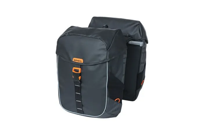 De Basil Miles Tarpaulin MIK is een sportieve dubbele fietstas in het zwart. De tas heeft stoere oranje details. De fietstas is gemaakt van sterk matzwart Tarpaulin en heeft een inhoud van 34 liter. Aan de zijkanten van de tas bevinden zich nog twee extra elastische vakken. Handig voor het vervoeren van een flesje drinken of een regenjas. De tas is daarmee ideaal voor het maken van een korte of lange recreatieve fietstocht. Of voor een fietsvakantie. Mocht het plots gaan regenen, dan blijven je spullen droog. De tas is namelijk waterdicht en is voorzien van getapete naden en een roltopsluiting. De reflecterende details op de tas maken dat je beter zichtbaar bent voor andere verkeersdeelnemers. Daarnaast kun je extra LED-verlichting aan je tas hangen. De dubbele fietstas beschikt namelijk over verschillende lusjes voor LED-verlichting. Heb je veel en zwaardere spullen in je tas? Dan kun je de tas combineren met de Basil Afstandhouder (apart verkrijgbaar). Deze houder voorkomt dat de tas in de spaken van je fiets komt. Je bevestigt de tas eenvoudig dankzij de voorgemonteerde MIK-adapterplaat. Met deze adapterplaat klik je de fietstas eenvoudig in jouw bagagedrager met MIK-profielen of een MIK-bagagedragerplaat. Wil je de tas meenemen de winkel in? Dan klik je de mand er net zo gemakkelijk weer af. De MIK-adapterplaat past op veel bagagedragers, dames-, heren-, en de elektrische fiets.