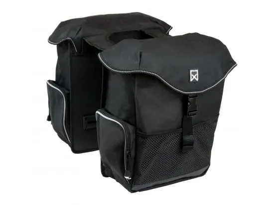 De Willex Dubbele Bagagetas is een sportieve tas die, zoals dat heet, van alle gemakken is voorzien. Een totale inhoud van 34 liter draagt u in compacte vorm mee achterop de fiets. Er zitten twee ritsvakken in én er is een handig voornet opnieuw aan beide zijden van de tas. Alleen echte kwaliteit kan overleven in het drukke stadse verkeer. Vanuit die gedachtegang ontwikkelt het Belgische Willex producten van hoogwaardige, duurzame materialen. Alle artikelen worden uitgebreid getest op waterbestendigheid, treksterkte en kleurechtheid. Het gaat dus net als alle andere tassen van Willex om een goed product dat nog zeer lange tijd meegaat. Het polyester is waterdicht en waterafstotend. Voor wanneer het echt flink gaat regenen, is er de regenhoes. Deze krijgt u er gratis bij! Sowieso is de tas goed af te sluiten, onder andere via een trekkoordje aan een extra cover, naast de grote flappen die dichtgaan met een solide kliksluiting. U koopt met deze compacte dubbele tas – die geschikt is voor e-bikes – ook extra veiligheid, in de vorm van een reflecterende bies. Ook de regenhoes is voorzien van goede Willex reflectie. Een nauwkeurige afwerking maakt deze kwaliteitstas compleet. Los nog van de speciale accessoire die u aan uw bestelling kunt toevoegen: de afneembare tasdrager. Hiermee maakt u van deze tas heel gemakkelijk een pakaftas! Hoe het precies werkt, leest u bij de omschrijving van de slimme Willex afneembare tasdrager.