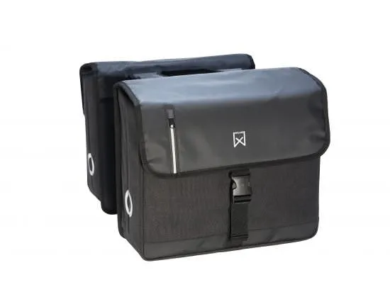 Een dubbele Business fietstas van Willex in bruin en zwart. Deze supersterke Willex is mooi in zijn eenvoud. De twee ruime compartimenten van de tas zijn samen goed voor 30 liter inhoud. Gemaakt van waterdicht katoenen canvas, met reflectie op de zijkant. Het stevige canvas maakt deze dubbele fietstas elegant en sterk tegelijk. Bovendien is dit katoenen canvas waterafstotend. Om inregenen te voorkomen is de klep van de tas voorzien van regenflappen. Ook de binnenkant is bestand tegen vocht, dankzij de voering van waterdichte stof. Op de voorkant van de klep van de tas zit een klein opbergvakje met een ritssluiting. Deze dubbele fietstas bevestigt u eenvoudig aan uw bagagedrager met de bevestigingsriempjes. Voor extra stevige bevestiging aan uw fiets zit er onderop de achterplaat ook nog klittenband. Gereedschap is dus niet nodig! De tas heeft verstevigde bodemplaten en zijplaten, zodat hij zijn vorm behoudt. De grote gespen en de reflectie aan de zijkant maken deze tas helemaal af. Optioneel kunt u voor de tas nog de los verkrijgbare extra wielbeschermers bestellen. Andere kleuren en maten. De dubbele Businesstas van Willex is een fraai voorbeeld van de kwalitatief goede producten van dit Belgische merk. Deze dubbele fietstas is zeer geschikt voor e-bikes en te verkrijgen in meerdere kleuren en inhoudsmaten.