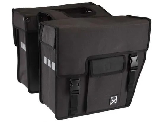 De dubbele fietstas van het Belgische merk Willex bestaat uit twee afgeschuinde compartimenten. Hierdoor hebben uw hakken extra ruimte tijdens het fietsen. In andere woorden: u toucheert hiermee zeker niet uw fietstas. Irritatiefactor nul dus. Naast de waterafstotende en waterdichte eigenschappen van het gebruikte materiaal, zorgen ook de regenflappen ervoor dat bij er nat weer geen druppels de tas kunnen binnendringen. De korte flappen kunnen met flexibel aangebrachte strookjes klittenband worden vastgezet aan de lange flap. Zo ontstaat een volledige kap als sluiting en doen ook de korte regenflappen volledig hun werk. Uw spullen zijn verder goed beschermd met de harde bodem- en zijplaten. Ook is er een speciale plek voor kleinere spulletjes: in de twee met klittenband afsluitbare, tikkeltje sjieke voorvakjes. Het grotere geheel met kap gaat aan beide kanten dicht met twee klikgespen. De voorvakken blijven daarbij bereikbaar. De extra grote reflectieblokken (meerdere aan voor- én achterzijde) maken deze sterke tas goed zichtbaar in het verkeer. En daarmee uzelf. Zeker voor in de wintermaanden geen overbodige luxe. Bovendien is de tas geschikt voor het plaatsen van ledverlichting.