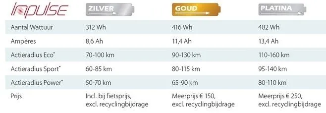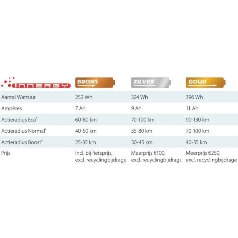 Iedereen fietst anders. Daarom heeft u bij de Orange Pure Innergy keuze uit vier verschillende accu's: Brons, Zilver, Goud of Platina. Ieder met z'n eigen, royale kilometerbereik.