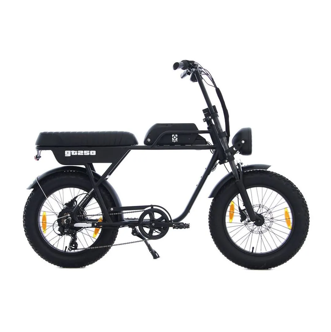 De fatbike heeft trapondersteuning tot 25 km/h. Een (bromfiets) rijbewijs is niet nodig en een minimum leeftijd is er niet. De AGM GT250 is er voor jong en oud!
