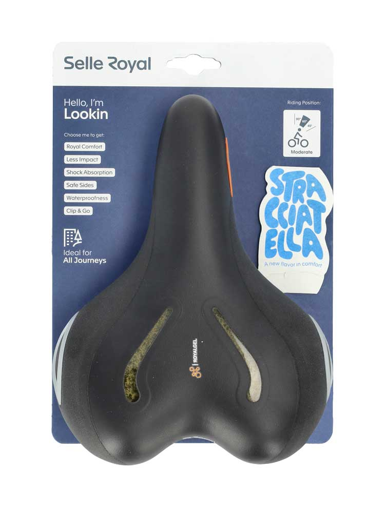 De Stracciatella-serie van Selle Royal omvat iconische zadels met een vernieuwd en duurzaam hart, vervaardigd uit gerecyclede zadels. De Selle Royal Lookin laat comfort en duurzaamheid zien dankzij een uniek ontwerp met vensters op het zadeloppervlak, waardoor de ondersteunende Royalgel™ vulling en het innovatieve Stracciatella schuim binnenin zichtbaar worden. Afgedankte zadels worden gesloopt en afgebroken tot kleine korrels die worden verwerkt in het schuimmateriaal. Het zadel heeft ook inzetstukken aan de zijkant om het zadel te beschermen tegen slijtage en scheuren. Ook bezit het zadel over schokabsorberende elastomeren voor een optimale drukverdeling en een geweldig rijgevoel.