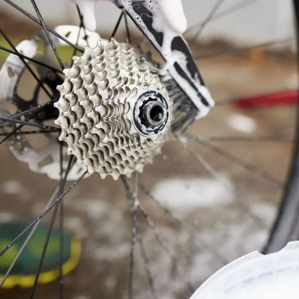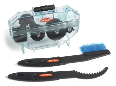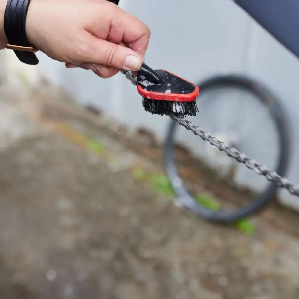 Grote reinigingsborstel met zachte haren (voor o.a. frame en kwetsbare onderdelen) Flexibele dubbelborstel (voor o.a. cranks, pedalen etc.)